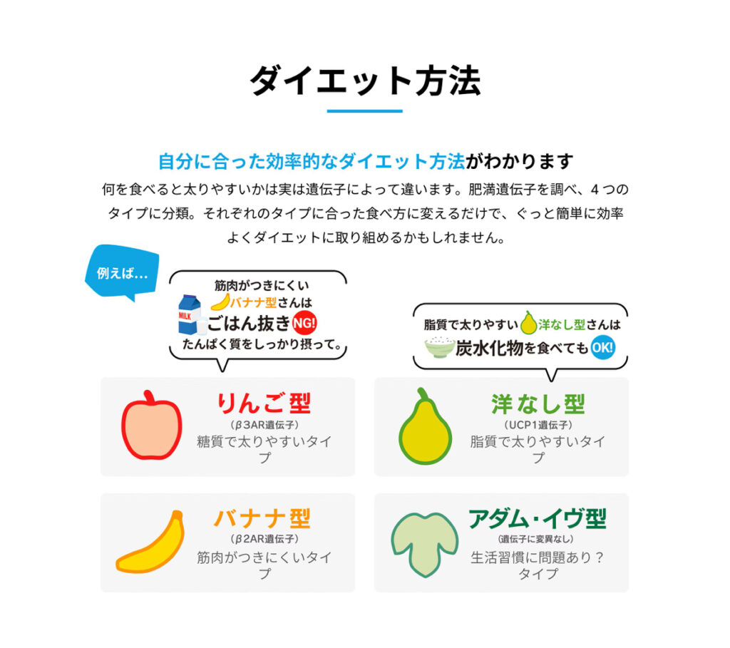 ・ダイエット遺伝子を知ることで、普段の食事調整がしやすくなった!太りやすい食べ物がわかるので、急激に体重が増えることがない