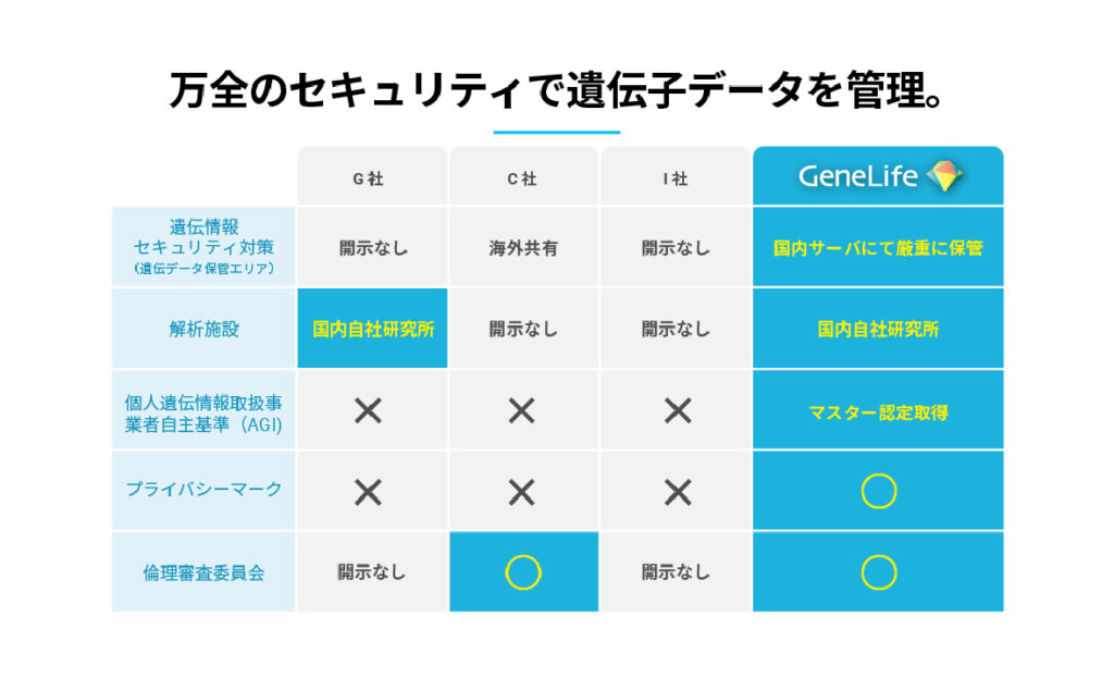 個人情報管理について不安だったのですが、ジーンライフでは、すでに豊富な検査実績があり、万全のセキュリティでデータ管理されていることを確認し、検査を受けました♩